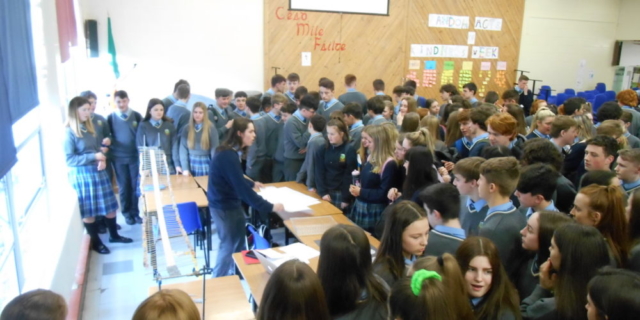 Conor Boyle, Jason fung and Deniss Danislovs presented the wonderful and intricate world of Computer Programming, which makes these computers tick over.. They had prepared many challenges for the students at their stand, encouraging them to learn and understand different programming languages. Daniel Laffan had great and lively interest around his stand, as he explained the propulsion of rockets. He had many rockets firing across the length of the hall with different students doing their best to catch them at the other end. Christopher Thomas built a wonderful “Jelly Baby” Wave machine and enthralled the crowds of students around his stand with his energetic and enthusiastic presentations. He even warded off those hungry students who were trying to sneak a jelly baby !!! Mark Butler and Cealan clarke did some very interesting hands-on demonstrations of Density and Flotation. There were coke cans sinking and floating and lots of multi-coloured liquids on display for the students to guess at their different densities. Why does a can of normal coke sink but a can of Diet Coke floats ???? Sean did a brilliant job of holding the fort and demonstrating his project. Unfortunately Jack Crennan, his project partner, was unable to make it, which was a pity as they had done some great work on their project. Niall Begley and Przemyslaw Biejanski demonstrated the Laws of Gravity and investigated centres of Gravity. They had some interesting challenges for the students at their stand, with some students finding it difficult to stay standing or others not able to get out of the chair. Conor Fetherston and Nathan Clynes took on the difficult task of trying to explain Black Holes and other Singularities to their students. They had a fantastic demonstration simulating the bending of the space time continuum around a black hole, using marbles to show the dense gravitational effect. Ellie Fanning and Mona Ohm (what a great Physics surname !!) did a magnificent demonstration of Sound in Vacuums and the lack of Air resistance in vacuums. They had marshmallows expanding and exploding. They were losing the sounds of their speakers in their vacuum and “the Pretenders” were no longer “walking their 500 miles”. It was a lot of hard work creating these vacuums each time.